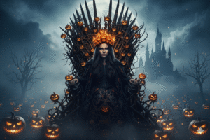10. Pumpkin queen sitting on thorn throne, glowing crown, candle-lit pumpkins surrounding her, cinematic HDR tone, 4K regal atmosphere