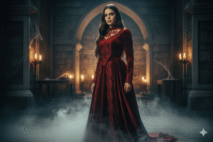 - Vampire queen throne scene, moody dark tones, candle-lit shadows, cinematic realism.