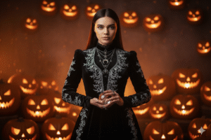 - Pumpkin-lit close-up, orange reflections on skin, cinematic spooky elegance.
