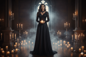 - Candle-lit gothic studio shot, glowing eyes, warm cinematic tone.