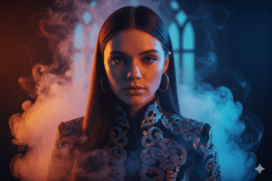- Witchy high-fashion look, neon purple smoke, glowing candles, 4K cinematic vibe.