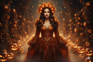 - Pumpkin queen aesthetic, glowing jack-o’-lanterns, warm soft focus, cinematic glamour.
